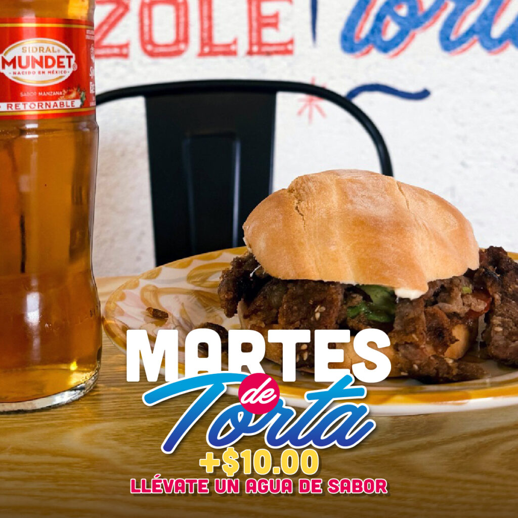 Pan con cama de frijoles, relleno de papa, queso, dos chalupas y salsa verde. A elegir: pollo, res, huevo cocido o chorizo.